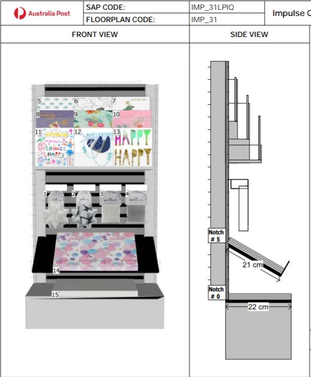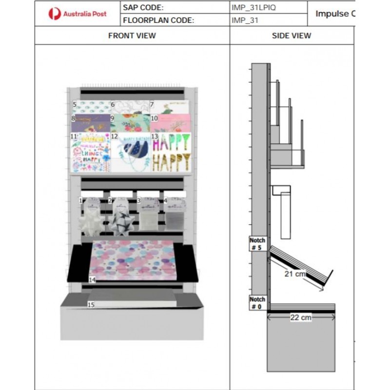 Click here to view or download the planogram -Impulse Queue Unit 31 (Double Sided Unit) - Greeting Cards